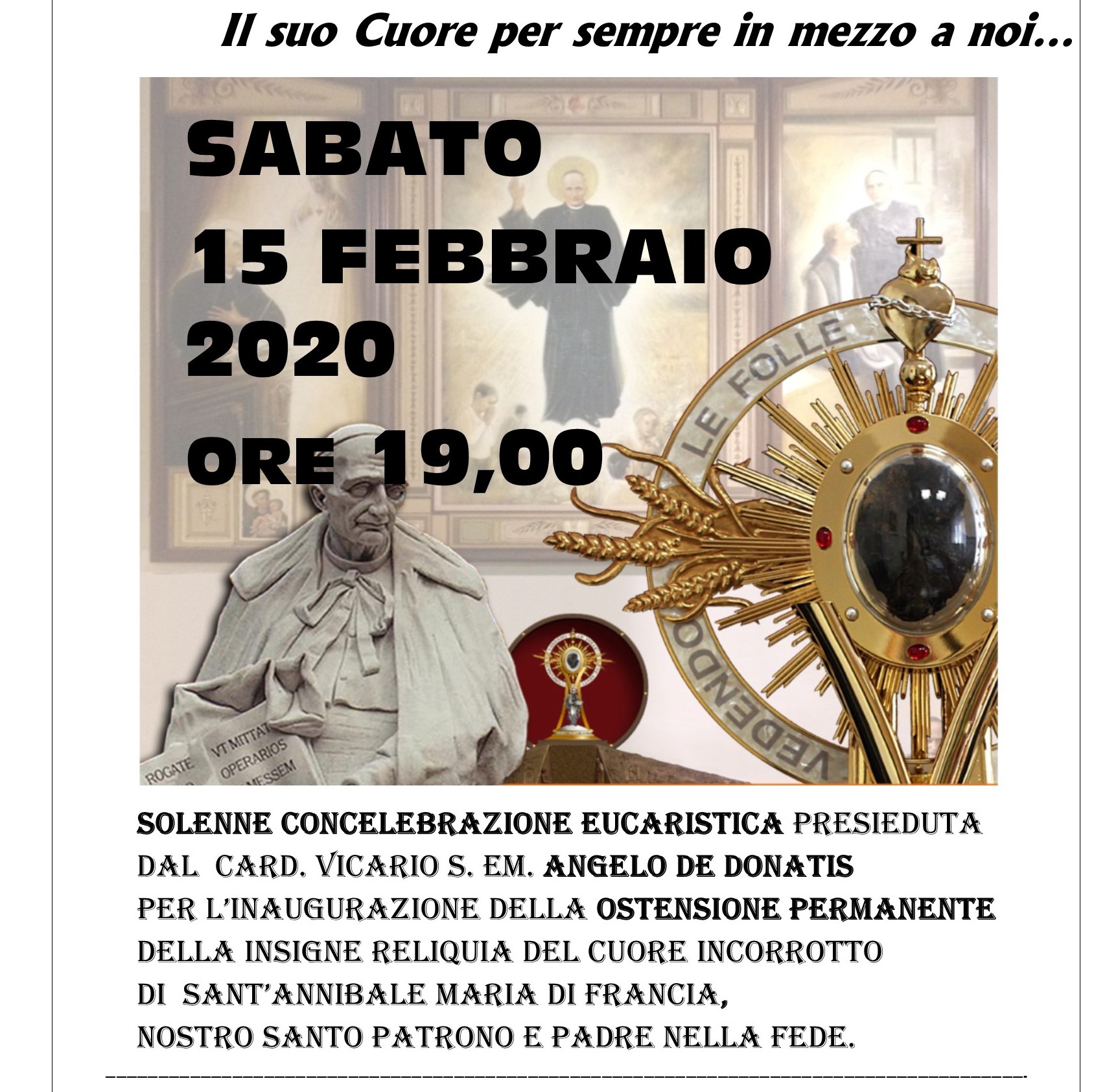 Sabato 15 febbraio 2020 alle ore 19,00 con una solenne concelebrazione eucaristica si inaugurerà l’ostensione permanente del Cuore di Sant’Annibale nella Chiesa dei SS. Antonio e Annibale Maria. La data è stata casuale, dettata dalla tempistica dei lavori di adeguamento della Cappella, ma per una felice coincidenza è anche la data della festa delle reliquie di S. Antonio di Padova, quasi a sottolineare il legame profondo che unisce i due Santi ai quali è titolata la Chiesa romana di piazza Asti. In questa stessa settimana, la Parrocchia accoglierà anche la statua della Madonna pellegrina di Lourdes ed anche questa è una felice coincidenza, perché come sappiamo, Padre Annibale è stato il primo ad introdurre il culto della Madonna di Lourdes nella sua Messina. In questi giorni si stanno ultimando i lavori che prepareranno l’accoglienza della insigne reliquia del Cuore incorrotto del nostro Santo padre. La struttura in marmo che ospiterà il Cuore di Sant’Annibale è stata realizzata insieme al reliquiario dalla Società “Mondarte” di Domenico Lomuscio in Trani. Di forma circolare, accoglierà quel segno grande di santità di Padre Annibale: il suo cuore che ancora continua a battere dal cielo e nel cuore dei suoi figli per i poveri e gli ultimi della terra. La chiesa parrocchiale dei SS. Antonio e Annibale Maria, dedicata anche al nostro Santo Fondatore è da sempre il primo segno della presenza dei Rogazionisti nella Città eterna, fin dagli anni ’50, essendo accanto alla Curia Generalizia e al Successore di Sant’Annibale, il Padre Generale. E' anche un evento storico per la nostra Provincia S.Antonio che terrà per sempre la reliquia del Cuore del Fondatore. Ci auguriamo che la presenza del Cuore di Sant’Annibale in Roma, possa alimentare sempre più lo spirito della supplica per le vocazioni e l’amore ai piccoli e ai poveri nella Diocesi del Papa. Proprio per questo motivo, presiederà la solenne concelebrazione eucaristica dell’inaugurazione, il Card. Vicario del Papa per la Diocesi di Roma, S. Em. il Card. Angelo De Donatis, al quale chiederemo ancora di considerare la nostra chiesa, luogo significativo in Roma per la preghiera per le vocazioni, vista la presenza ormai del Cuore dell’Apostolo della preghiera per le vocazioni.